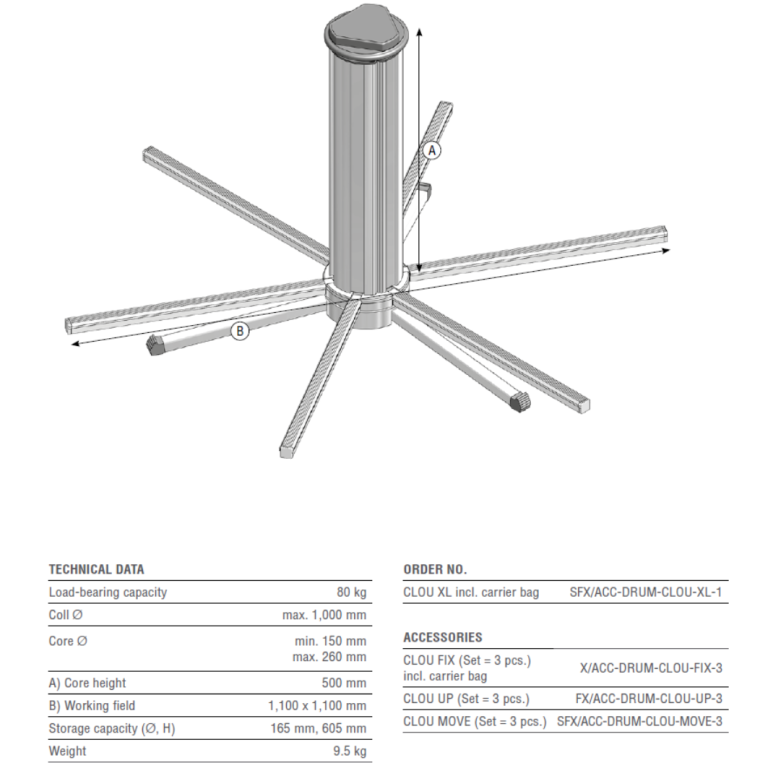 - Extended core height and enlarged work surface: With an extended core height and enlarged work surface, the CLOU XL is perfect for handling very large and bulky cable coils, such as corrugated tubing, polymer pipe, and heavy cable. It offers enhanced capabilities for demanding applications.