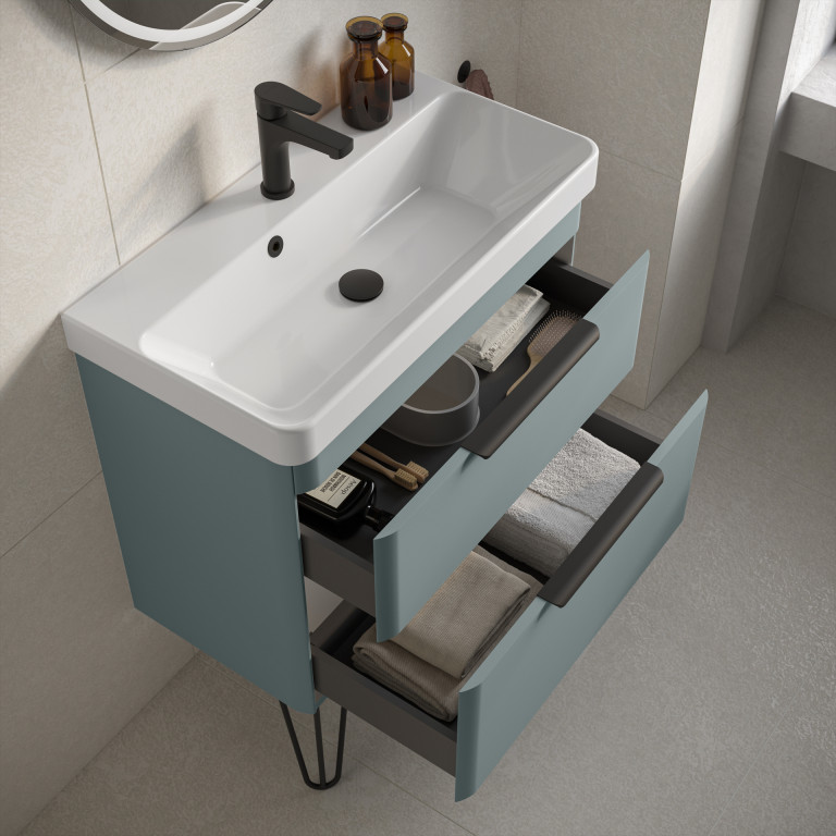 Crofton introduces a sleek and modern aesthetic with its gracefully rounded contours, a charming soft-matt finish and thoughtful features. Silent-close drawers ensure a smooth operation, while over-drawer handles contribute to Crofton’s clean and modern appearance. The ceramic basin complements the vanity's design and offers a durable and easy-to-clean solution for daily use, providing a sophisticated and functional addition to your bathroom.