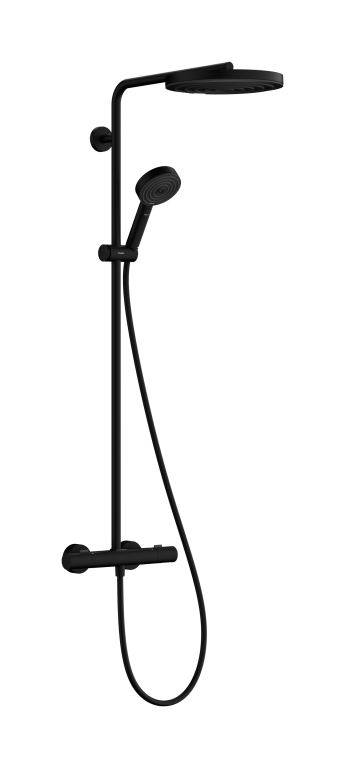 Pure design – pure showering pleasure. hansgrohe shower system in matt black with PowderRain