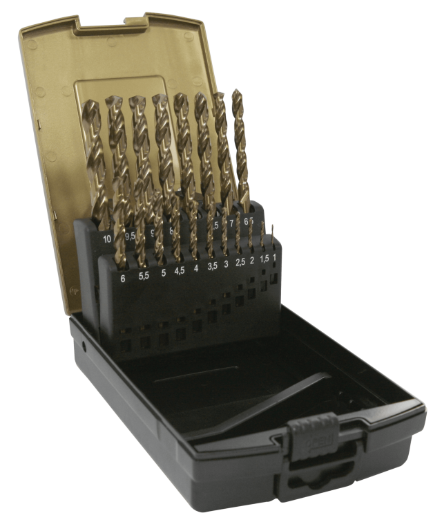 Precision engineered steel drill bits, with 5% cobalt shaft, for use on tough materials and hard steel, including stainless steel. Manufactured to DIN338 standards, with a 135 degree split point tip for drilling without pre-centring. The M35 Shaft with 5% Cobalt gives excellent resistance to heat and wear. Right hand cutting at 30 degrees. Suitable for drilling sheet metals, non-ferrous metal, steel, stainless steel, brass, cast iron. This set contains 1 to 10mm bits in 0.5mm increments.