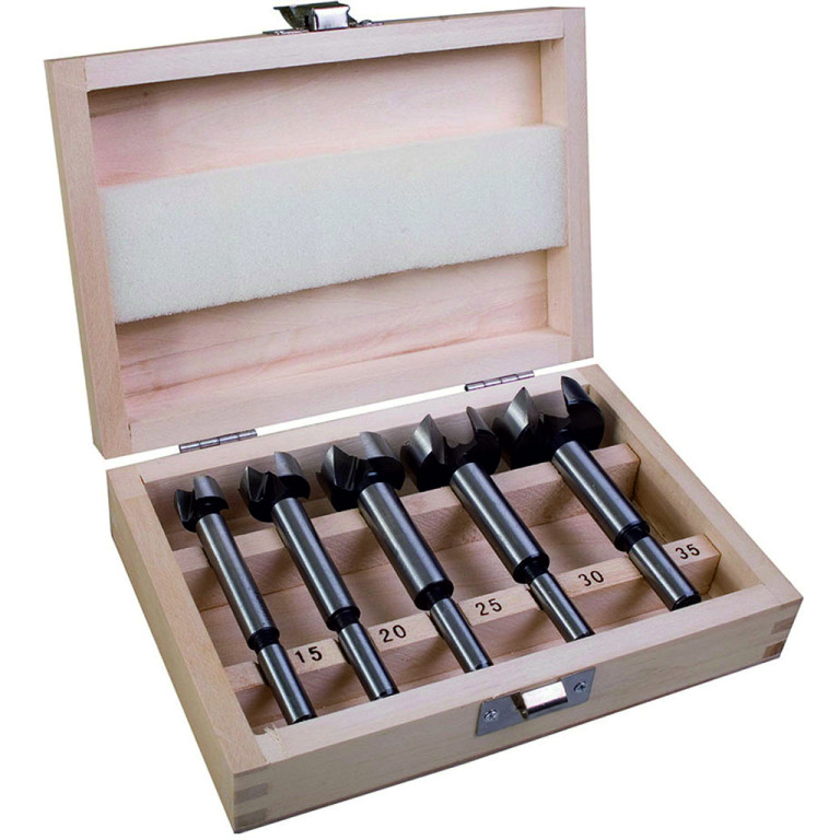 Download (0.12 MB)Precision drill bits for drilling wood material quickly and efficiently. Features two cutting blades. Smooth hole drilling action giving tear free hole edges, ideal for hinge sinking. Suitable for drilling hardwood, softwood, laminated chipboard, veneered wood, plywood and MDF. The set contains 15, 20, 25, 30 and 35mm bits.