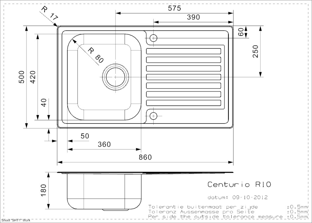 CENTURIO L 30, double bowl with drainer, integrated sink with no tap holes
