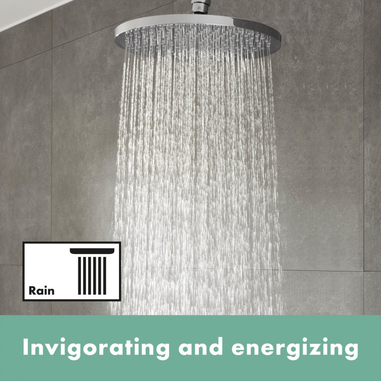 The spray pattern Rain delights with every shower, and pampers with sparkling feel-good moments. Thanks to the large spray disc diameter, the water is able to develop its full effect and offers a generous richness, for instance when washing the hair.